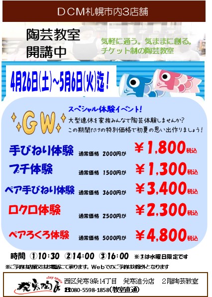 わたくしの担当します発寒陶房では、陶芸体験各種をお得な価格で