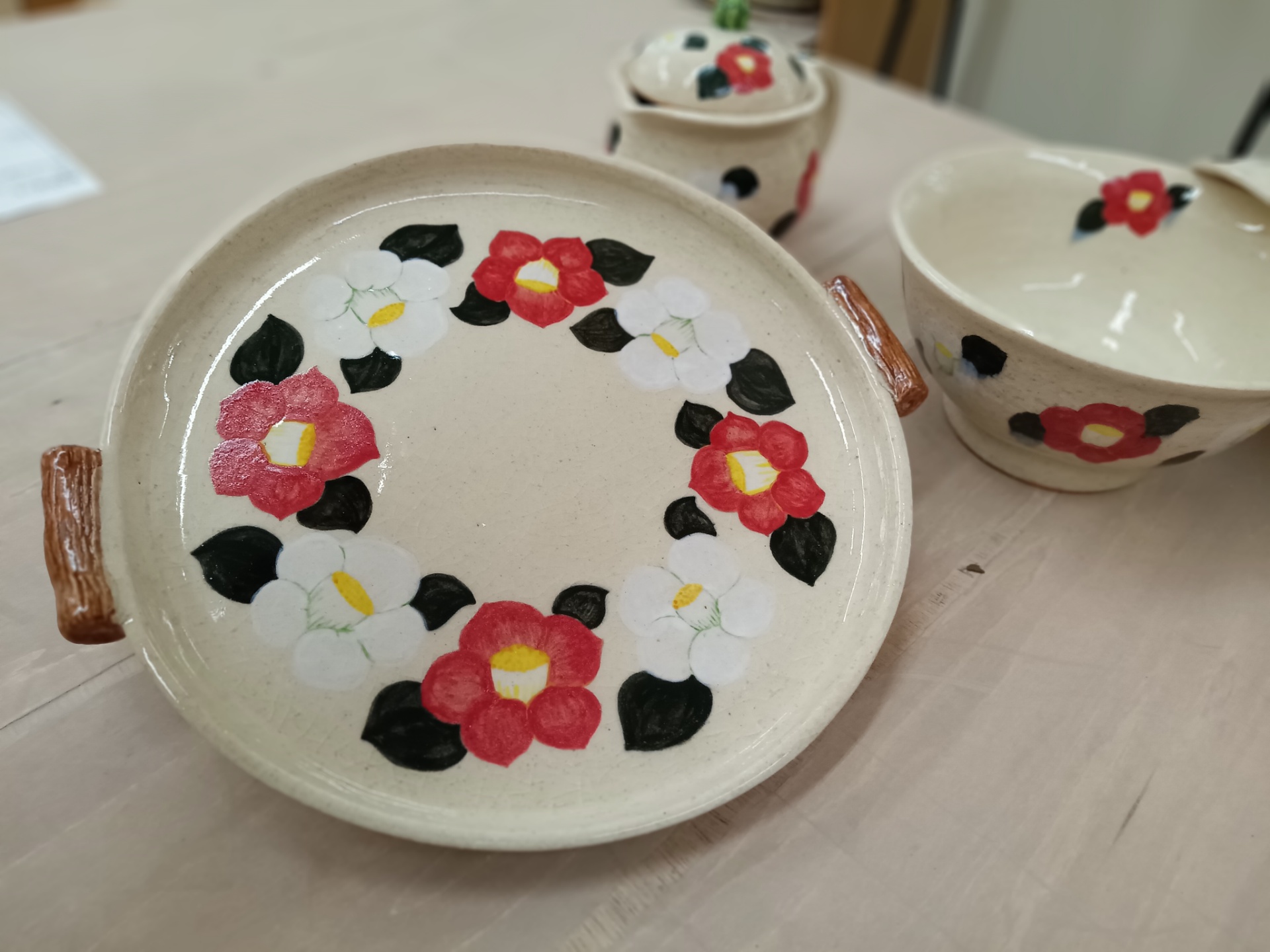 鮮やかな椿の絵付けが目をひくオーブン・直火対応のお皿です。