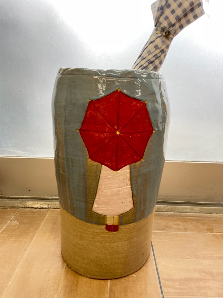 釉薬も青萩の流し掛けが水の流れのように掛かっていてとてもいい雰囲気になった傘立てになりました。