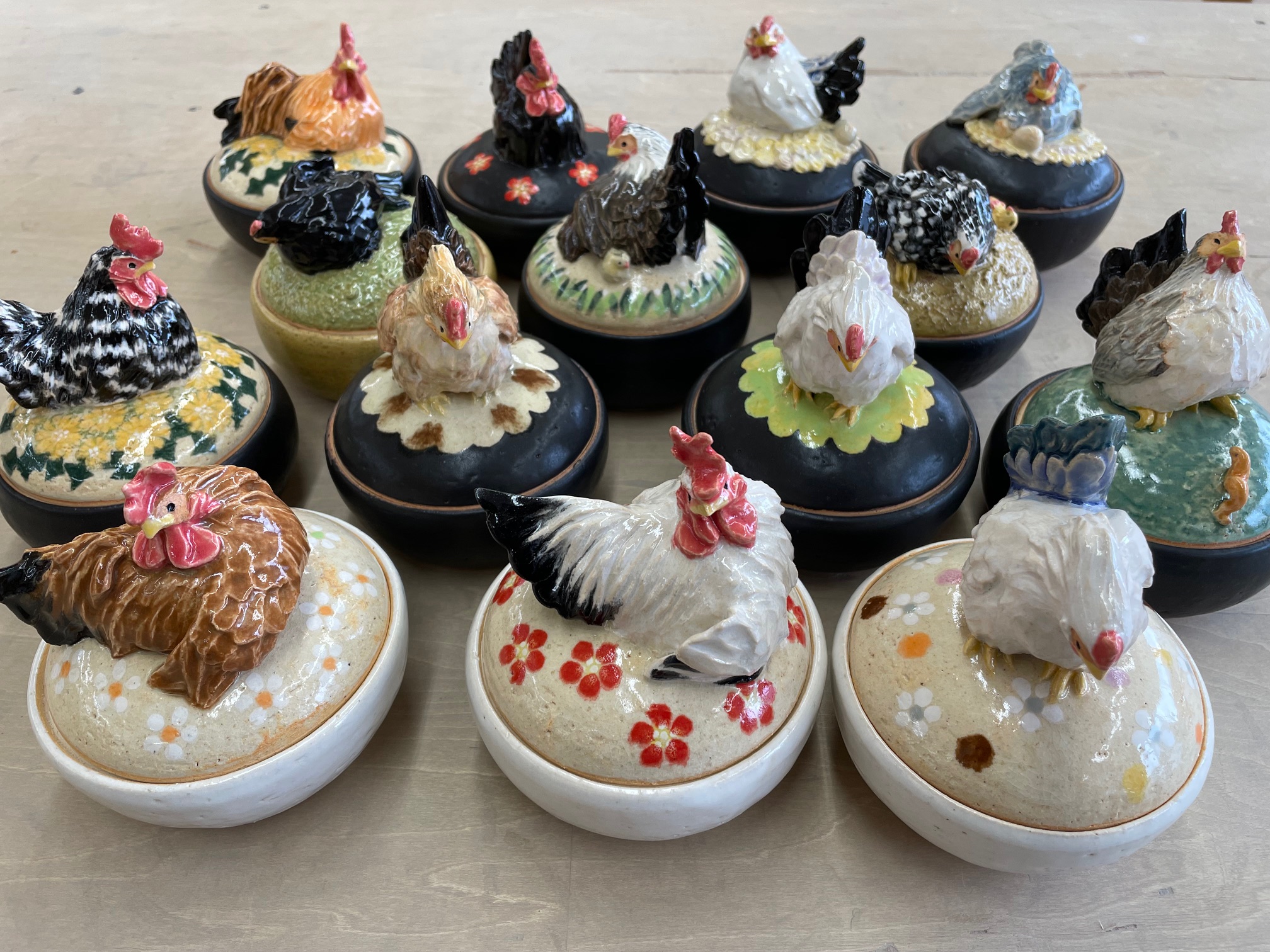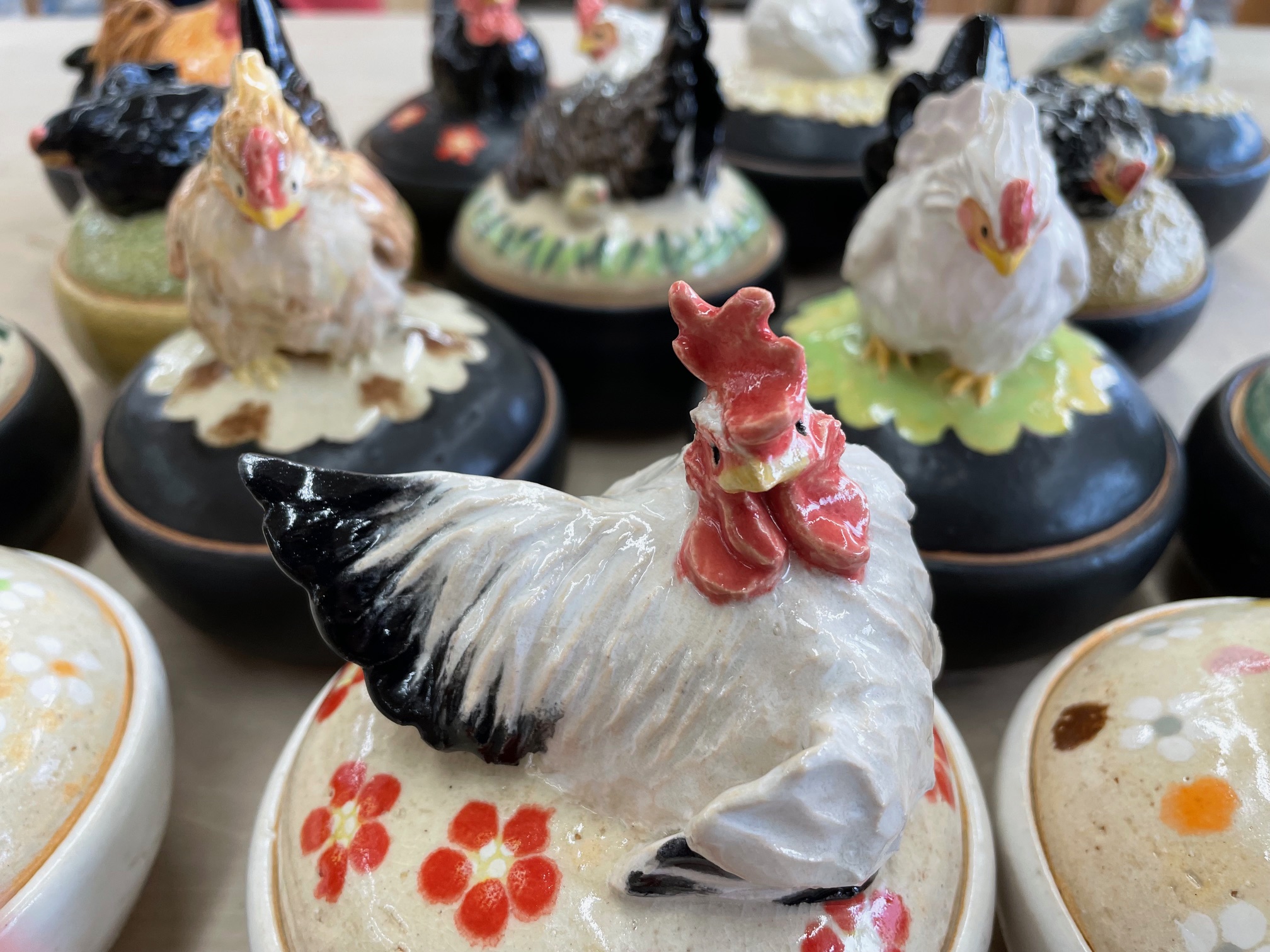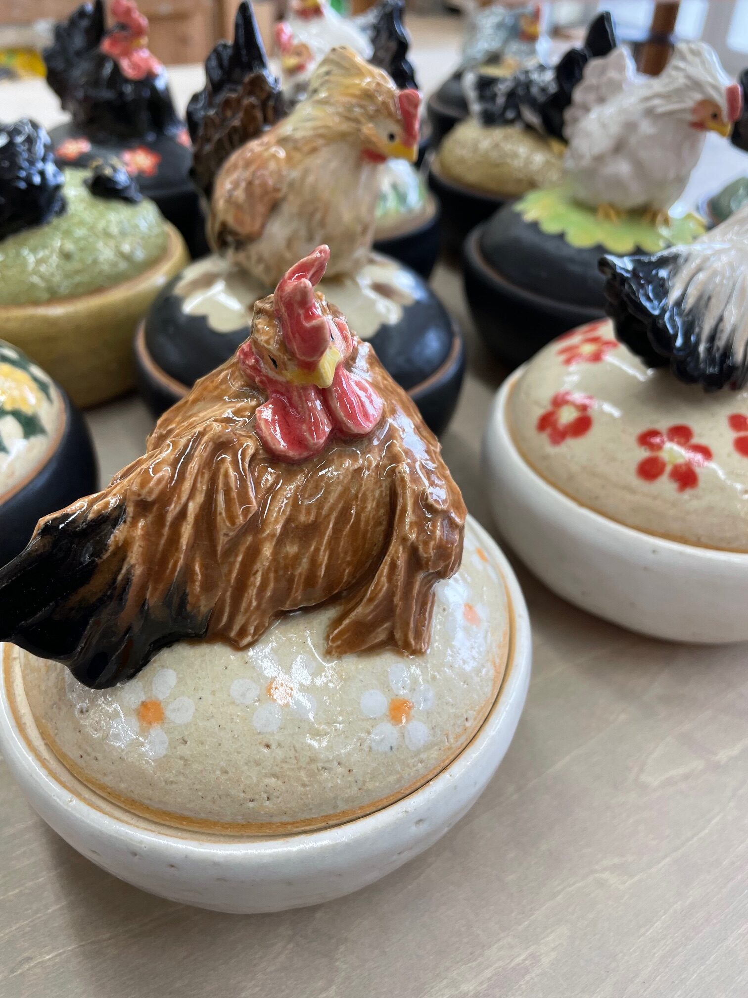 耐熱粘土で制作した大量のニワトリ(チャボ)が乗っかったミニ耐熱蓋物です。