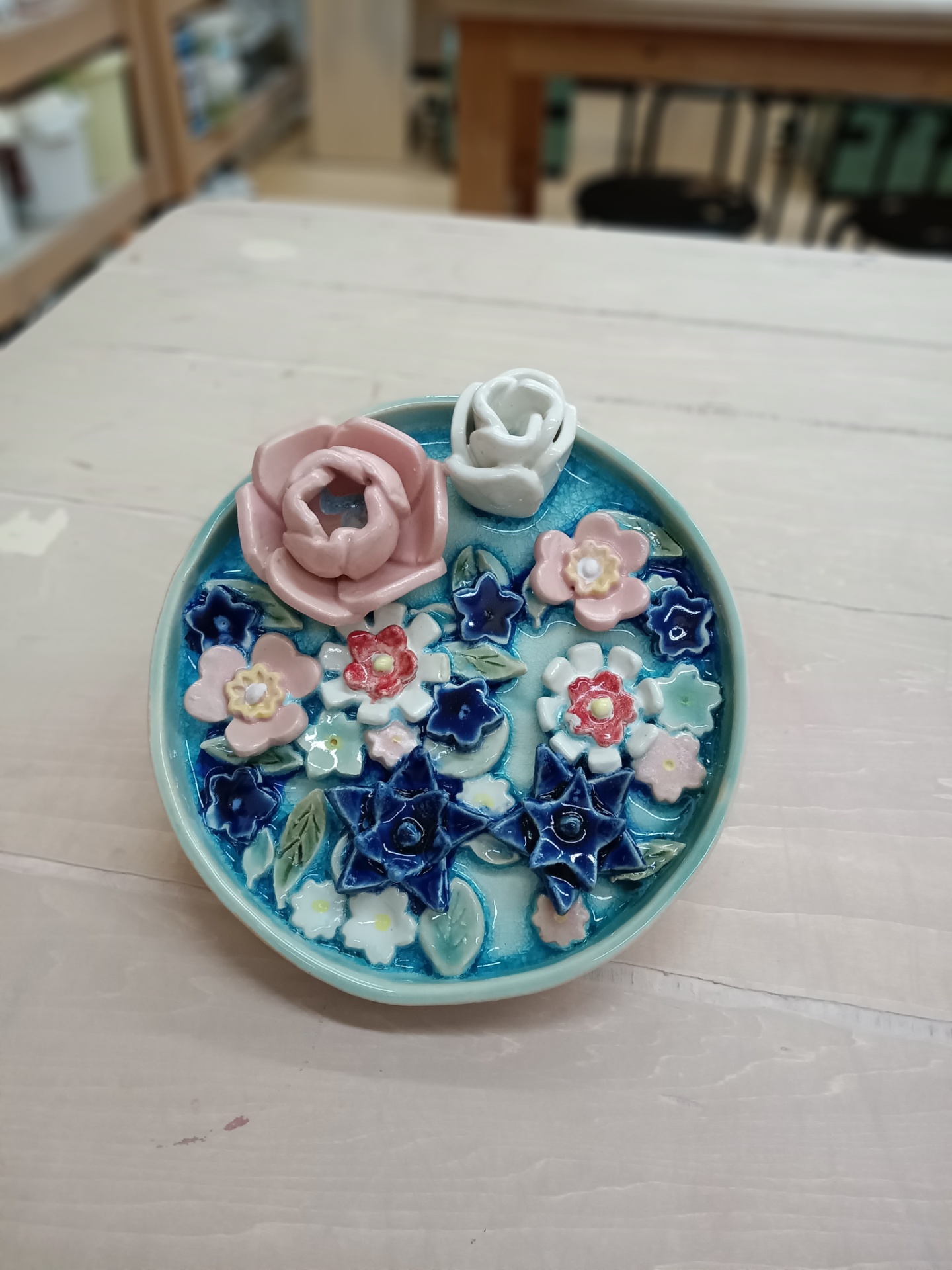 浅いタタラのお皿に細かく砕いたガラスを散りばめ、型抜きしたお花などを乗せて焼成しました。なんとも涼し気でいいですな。