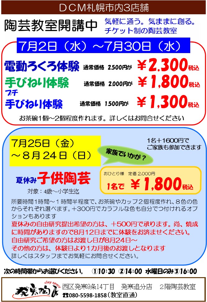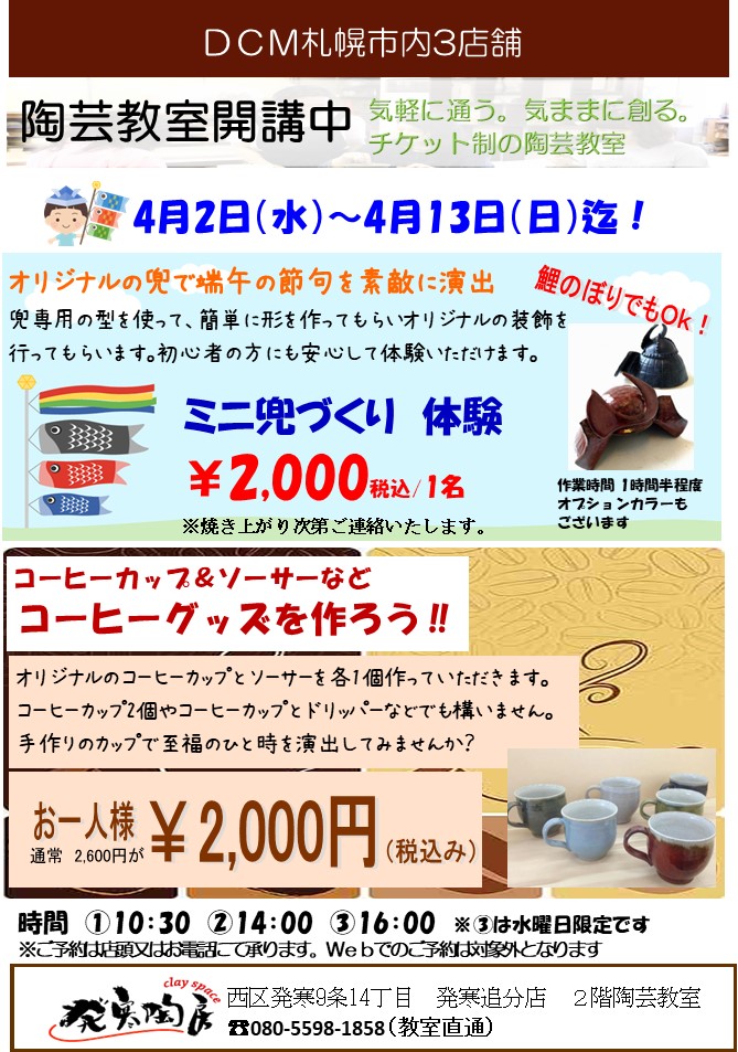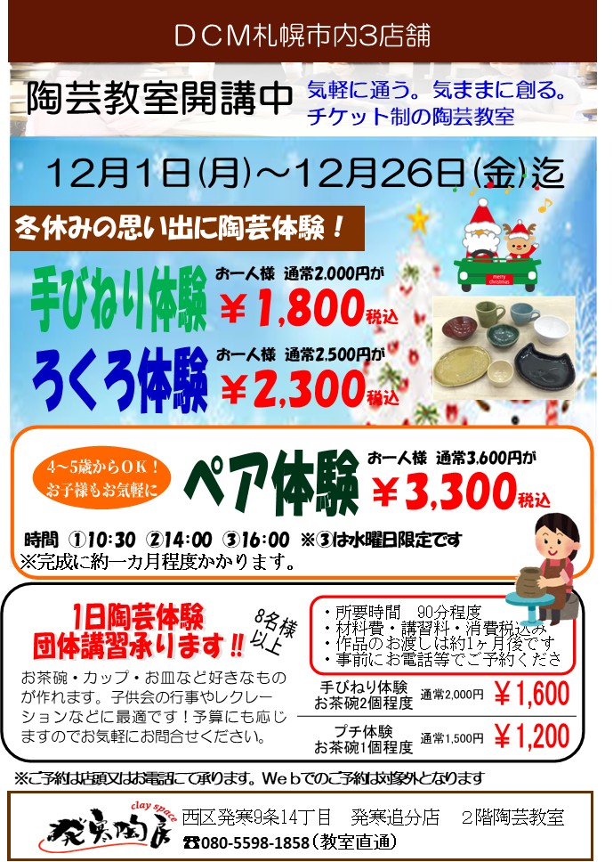 クレイスペース発寒陶房はDCMで札幌市内3店舗目の陶芸教室です。