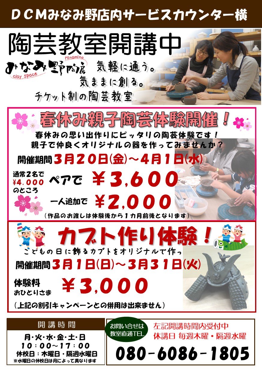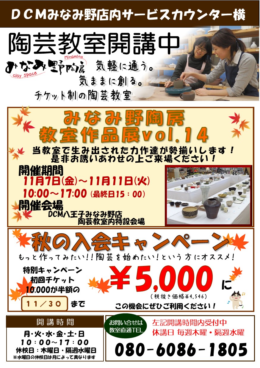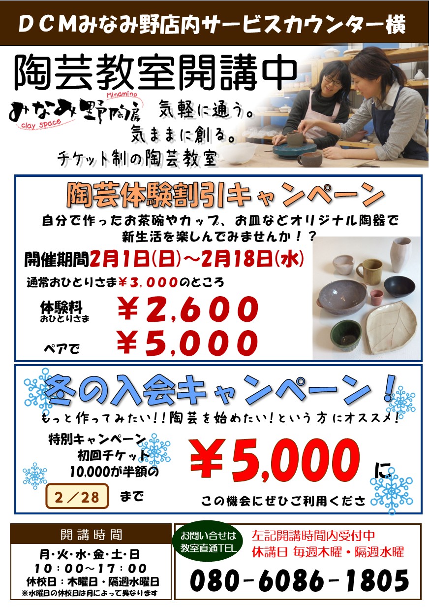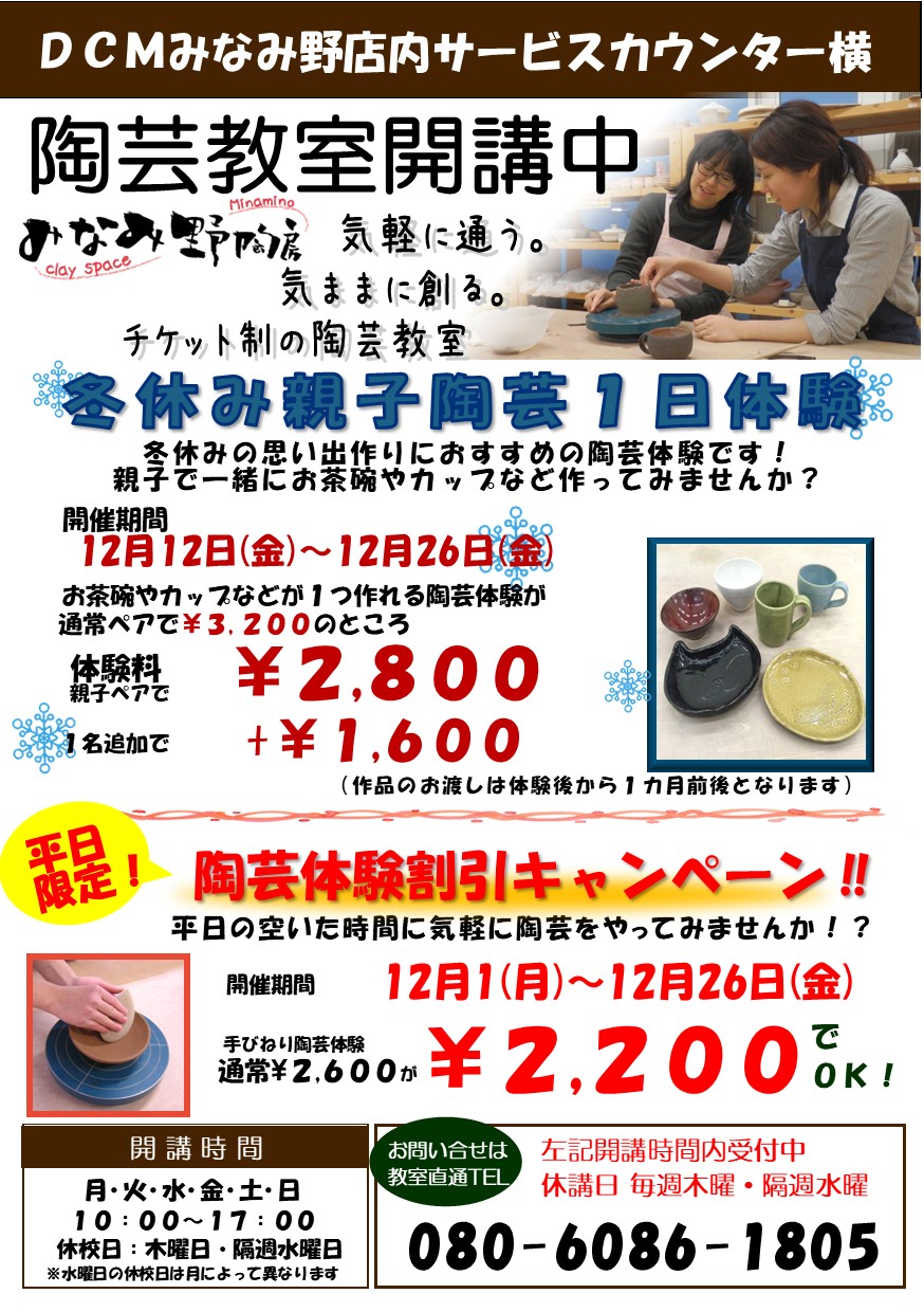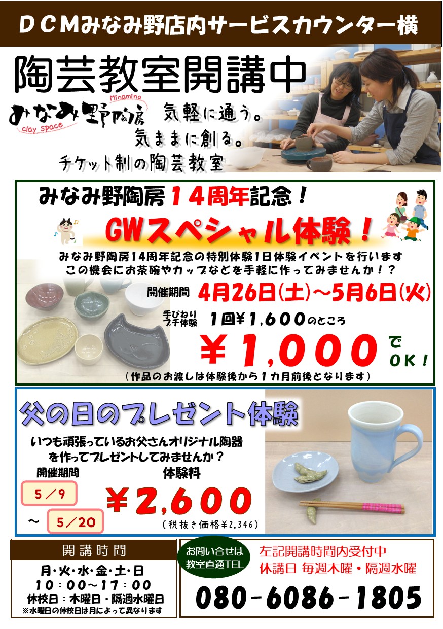 クレイスペースみなみ野陶房はDCM八王子みなみ野店で開講中の新しいスタイルの陶芸教室です。