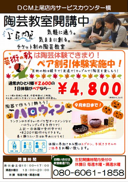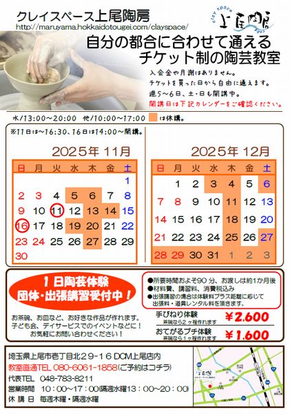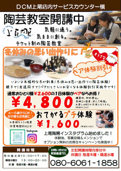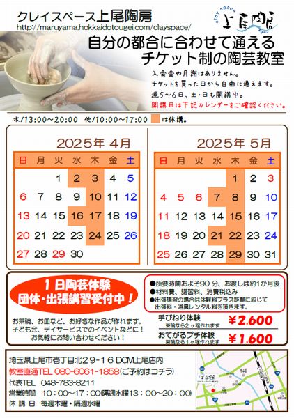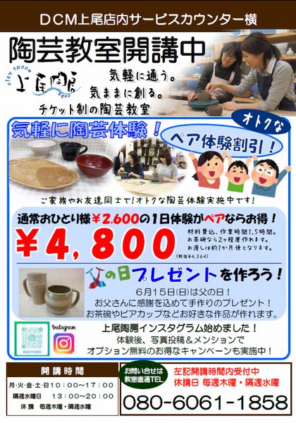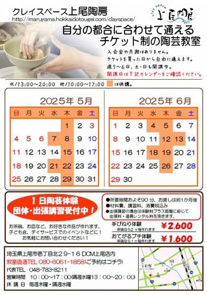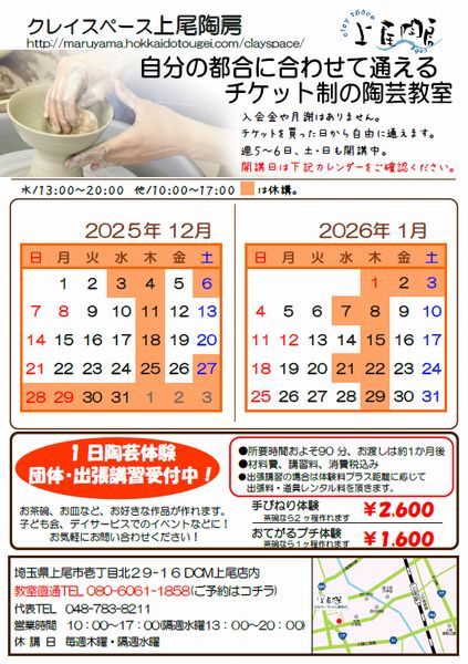 クレイスペース上尾陶房はDCMで関東圏2店舗目の陶芸教室です。充実した設備、広くて明るいスペースで陶芸が楽しめます。