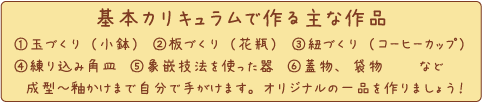 「基本は練りと、手びねりから。」 当教室の作陶スタイルです。 まずは手ろくろを使って、指先で厚みを伸ばす 感覚を確かめながら形を作っていきます。 小さな作品から、慣れてきたら土鍋など大きな 作品にも挑戦!お店では決して巡り会わない 工夫を凝らした作品に仕上げましょう! |